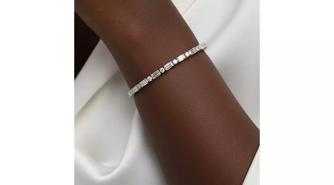 Read moreThis spectacular Alternating Emerald and Round Diamond Bracelet, set in gleaming 14K white gold, is a masterpiece of geometric brilliance designed to make a luxurious impact. The bracelet features a striking sequence of diamonds, where the elegant, elongated emerald-cut stones are set in a modern east-west orientation, perfectly framed by sparkling round-cut diamonds.
