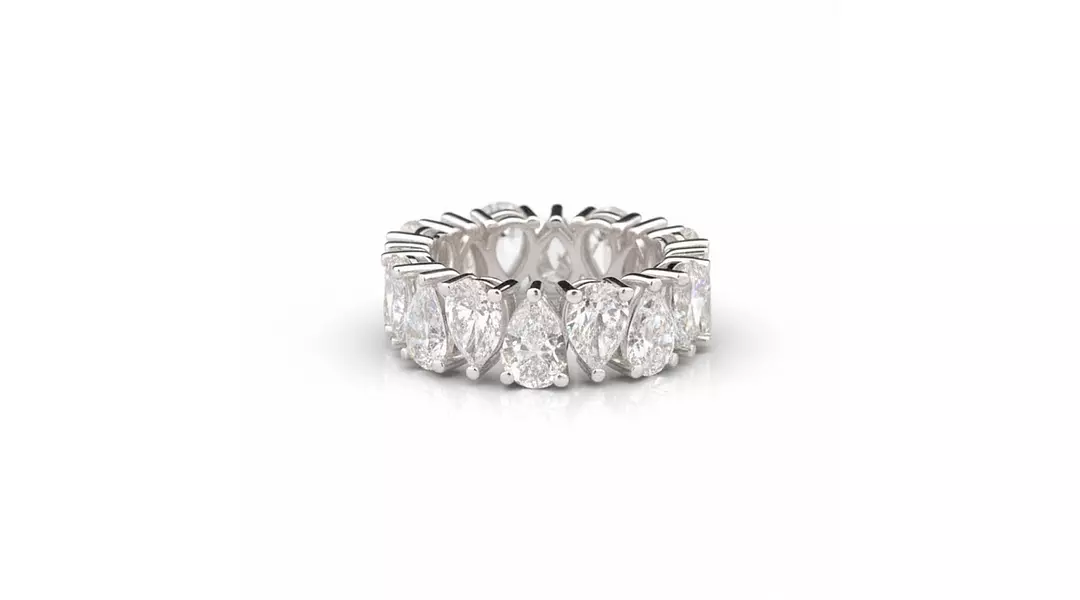 Alternating pear shaped eco diamonds line up in a perfect eternity band to create presence and brilliance worthy of a red carpet. Rent this beautiful diamond eternity band for your next special occasion.