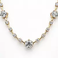 Read moreRent this contemporary take on the classic diamond tennis necklace and steal the spotlight at your next special event. This modern design tennis necklace features sleek bars connecting prong set round brilliant diamonds, alternating with larger round diamonds, creating a lighter, more relaxed alternative to the traditional continuous line of diamonds.