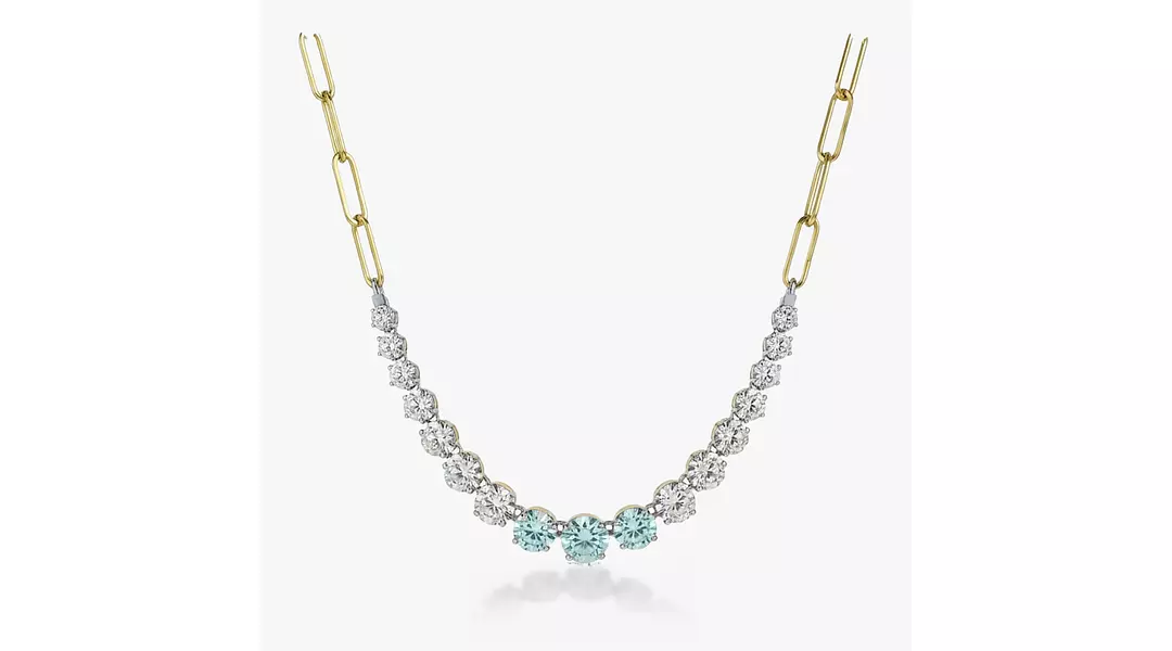 Elevate your style with the Blue and White Graduated Eco Diamonds Paperclip Necklace, designed for modern elegance. Featuring icy blue center diamonds, graduated white eco stones, and a sleek yellow gold paperclip chain, it delivers a perfect blend of luxury and sustainability.