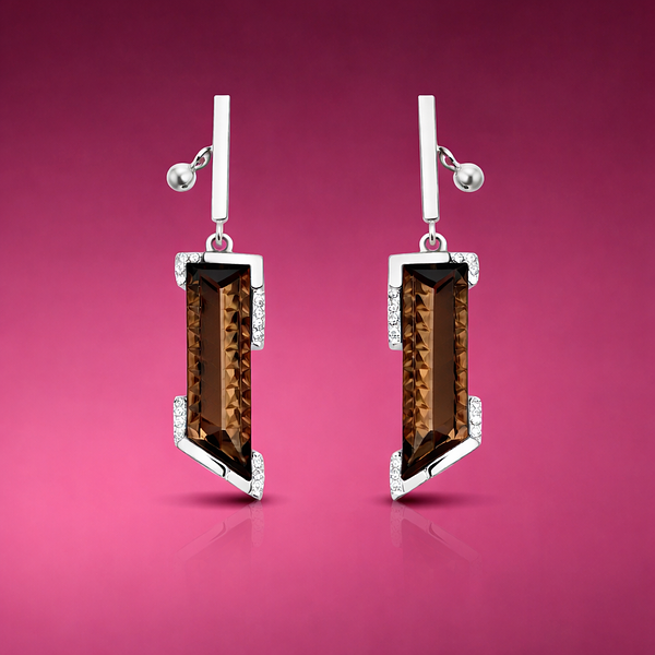Indulge in the luxurious allure of these exquisite earrings, crafted with precision in Germany. The focal point of each earring is a mesmerizing fancy-cut faceted smoky topaz, radiating an enchanting allure that captures attention. These lustrous gemstones are impeccably framed by modern...