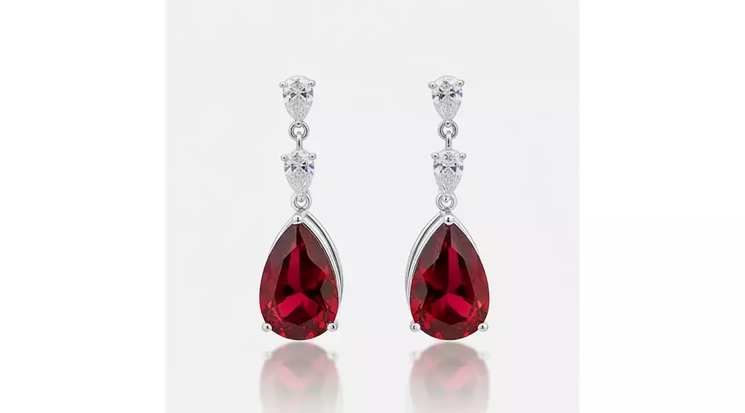 Accented with ten precision-cut eco diamonds, these luxury drop earrings balance boldness with delicate craftsmanship. The three-prong setting enhances light play, ensuring every angle sparkles with exceptional intensity. Rent these stunning rubies and diamonds drop earrings today for your next special event and steal the spotlight effortlessly and affordably.