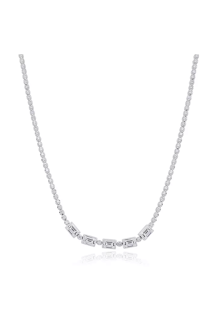 Read moreDiamond choker necklace in 14k white gold. Three stone design in an elegant shape creates a feminine flow as the choker hugs the neck. Chic and romantic at the same time, this choker is a show stopper, and best of all, pairs perfectly with a variety of styles and outfits. Step up your outfit game for your next special occasion, and borrow yourself some luxury experience. Elevate your style with our exquisite Diamond Choker Necklace crafted in stunning 14k white gold. The enchanting three-stone design gracefully molds into an elegant shape, creating a feminine and captivating flow that delicately embraces the neck. This chic and romantic choker is a true showstopper, offering a touch of luxury that seamlessly complements a diverse range of styles and outfits. Whether you're attending a special occasion or looking to make a statement in your everyday wear, this Diamond Choker Necklace effortlessly enhances your ensemble with its timeless beauty.