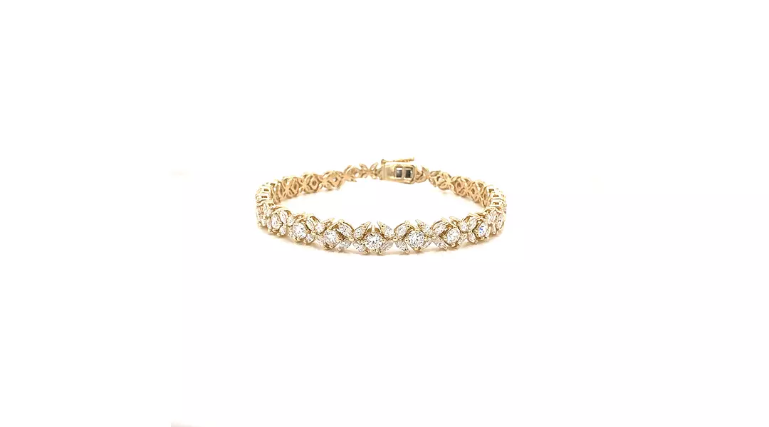 Read moreThis exquisite fancy bracelet showcases the timeless elegance of marquise and round diamonds, masterfully arranged to highlight their natural brilliance. Crafted in luxurious 14K yellow gold, the design blends classic sophistication with modern refinement. The exceptional EF colour and VS1 clarity of the 120 diamonds create a radiant display, offering remarkable sparkle from every angle. At 5.78 total carats, each meticulously selected stone contributes to a harmonious and dazzling composition.