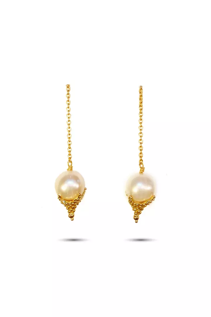 Cultured white pearls drop earrings, set in 18k yellow gold. Earrings feature interchangeable top - can be combined with any post back stud earring for a versatile look. Rent these gorgeous pearl earrings as a statement piece to complement your outfit for your next special event.