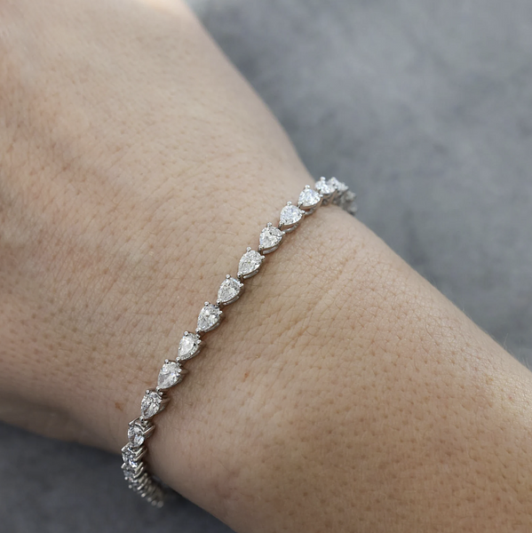 Read moreThis East-West pear-shaped eco-diamond tennis bracelet delivers an irresistible blend of elegance and innovation. Each pear-cut eco diamond is set horizontally in smooth 14k white gold, creating a fresh, unexpected silhouette that feels both contemporary and timeless. The elongated teardrop shapes catch the light with graceful flashes, giving the bracelet a fluid, shimmering rhythm as it moves.