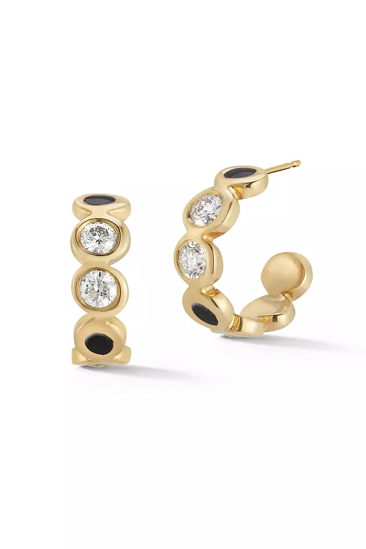 These black enameled hoops are mixed with diamonds for a sophisticated look.