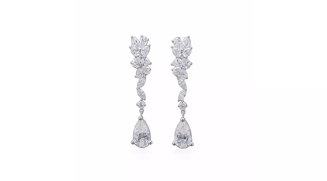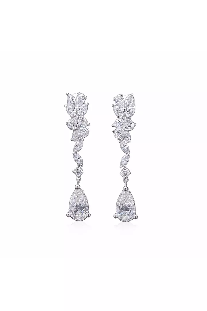 Read moreThese exquisite diamond drop earrings showcase a graceful floral-inspired design that flows effortlessly into a refined pear-shaped drop. Expertly set with brilliant-cut diamonds, each element is arranged to enhance sparkle and movement, creating a luminous cascade that catches the light from every angle. The elongated silhouette flatters the neckline, offering a perfect balance of elegance and sophistication.