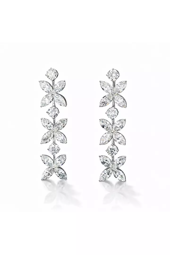 Read moreMake an unforgettable entrance with these eco diamonds floral drop earrings, designed with a cascading arrangement of marquise-cut and round brilliant diamonds that deliver exceptional brilliance and movement. These statement diamond earrings feature an elegant elongated silhouette that flatters the neckline while creating a luxurious, high-impact look perfect for black tie events, weddings, galas, and special occasions. Crafted to maximize brilliance and light reflection, the floral design combines timeless elegance with modern glamour, making them ideal for anyone seeking standout fine jewelry without the commitment of ownership. Rent these luxury diamond drop earrings on Trejours for a show-stopping finish that feels both sophisticated and effortlessly glamorous.