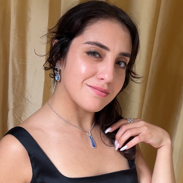 Read moreRaw blue topaz, white mother of pearl and faceted white topaz combine for a vibrant grey-blue with rainbow hues, accented by two round white diamonds. Timeless pear shaped design. Experience the enchanting allure of a timeless pear-shaped design with this exquisite piece featuring raw blue topaz, white mother of pearl, and faceted white topaz. The harmonious blend of these gemstones creates a vibrant grey-blue hue adorned with captivating rainbow hues, capturing the essence of elegance. Two round white diamonds add a touch of sophistication, elevating the overall aesthetic. This exceptional jewelry piece is not just a possession but an opportunity to rent a moment of radiance and borrow the beauty that transcends time.