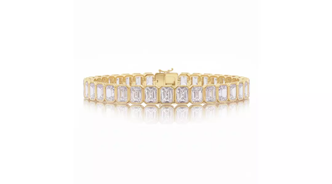 Read moreMake a bold yet timeless statement with this striking emerald cut diamond bracelet, available to rent for your next standout occasion. Set in rich yellow gold, each emerald cut eco diamond is bezel-set in a north-south orientation, offering a clean, architectural look with maximum brilliance.