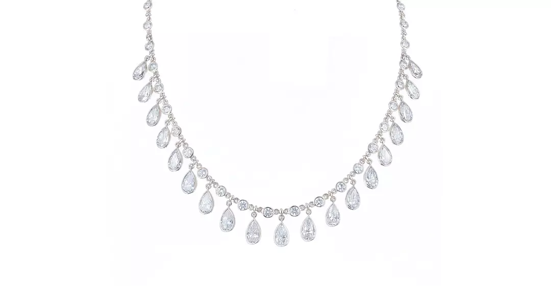 Available for rent, this eco diamond necklace delivers effortless elegance with a modern, responsible edge. A refined row of round eco diamonds forms the neckline, from which pear-shaped bezel-set diamond drops are suspended, creating soft movement and a beautifully balanced silhouette. The bezel...