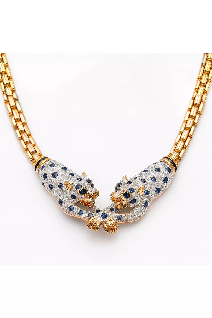 Read moreIntroducing this 18-inch 18K Yellow Gold Panther Necklace, a masterpiece of elegance and luxury. This exquisite necklace features two captivating panthers, adorned with 2 carats or dazzling diamonds and 1.5 carats of rich blue sapphires, set against a backdrop of radiant 18-karat yellow gold. With a versatile 18-inch length, it's the perfect blend of sophistication and style, making it the ideal accessory for any occasion. Elevate your jewelry collection with this timeless piece that effortlessly combines classic beauty with a touch of the wild.
