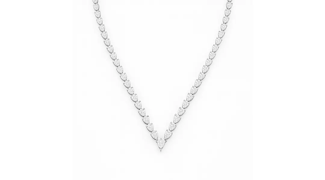 Read moreIf you are looking for an understated elegance, take a look at this chevron point inspired eco diamonds tennis necklace, set in 14k white gold. Elevate your style with this unique spin on a classic tennis necklace adorned with east west set pear shaped diamonds. This exquisite diamond necklace is designed to complement a variety of necklines, making it the perfect jewelry choice for your next glamorous event. Rent this gorgeous diamond necklace and make your next special event a Red Carpet event.