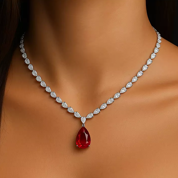 Pear Shaped Diamond Tennis Necklace with a Ruby Drop Pendant