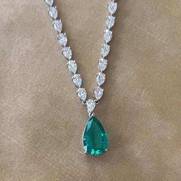 Pear shaped Diamond Tennis Necklace with Eco Emerald Drop