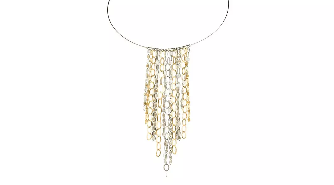 Shimmering cascade of multicolored strands attached to a round omega necklace make this piece super fun and bold! Part of the latest collection of French jewelry designer Frederic Duclos, this bib necklace is guaranteed to rake in the compliments. Rhodium plated for tarnish free maintenance, with...