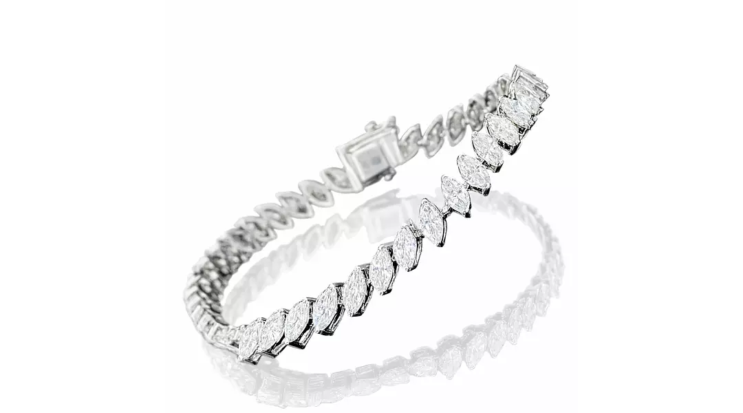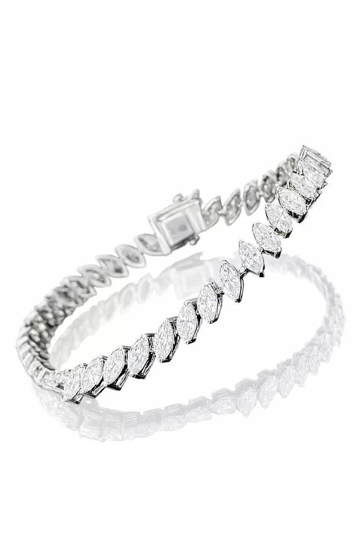This exquisite tennis bracelet is a refined expression of elegance and timeless luxury. Crafted in luminous 14K white gold, it features 45 perfectly matched marquise-shaped diamonds that flow seamlessly around the wrist. With a total diamond weight of 9.42 carats, each stone displays a beautiful FG colour and VS clarity.