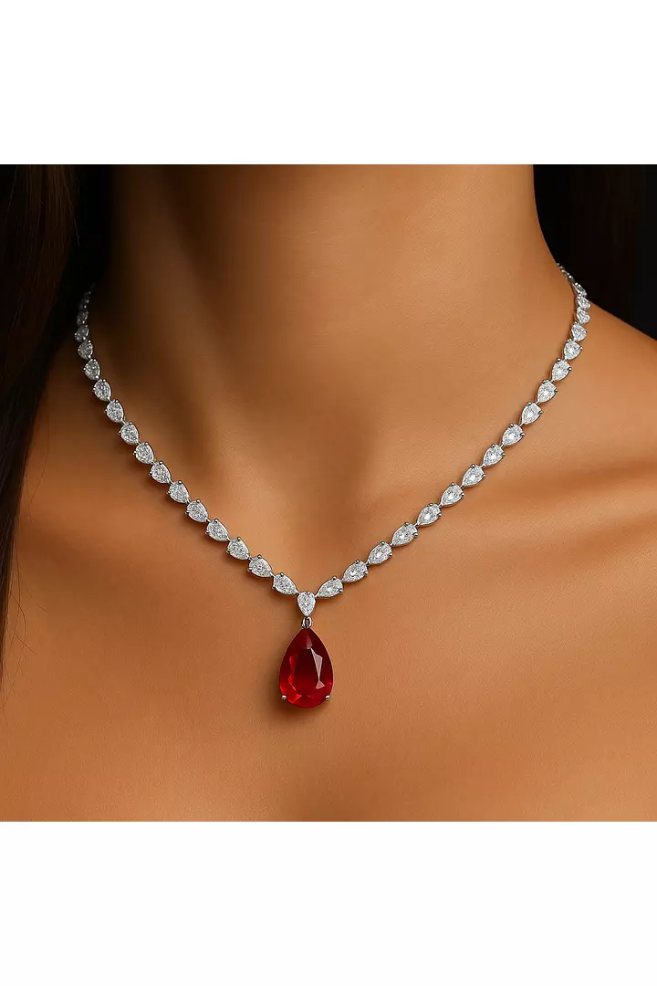 Read moreCommand attention with this striking ruby and diamond drop necklace, available to rent for your next special occasion. Set in polished white gold, the design features a continuous line of pear-shaped diamonds in a tennis necklace style, each matched in size and brilliance for a seamless, elegant look. At the center, a vivid pear-cut ruby pendant adds a dramatic pop of color and regal sophistication.